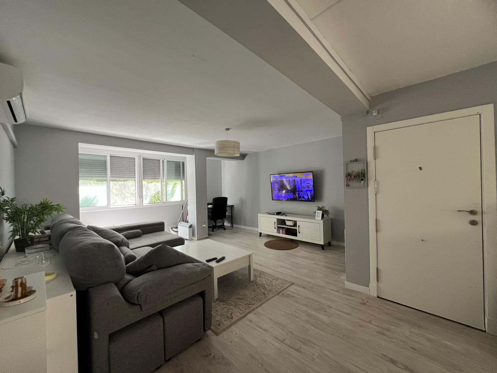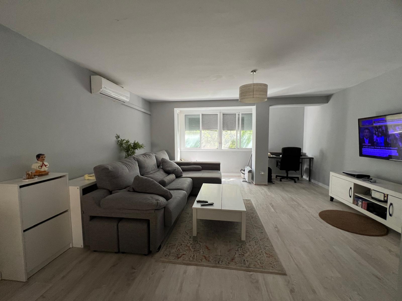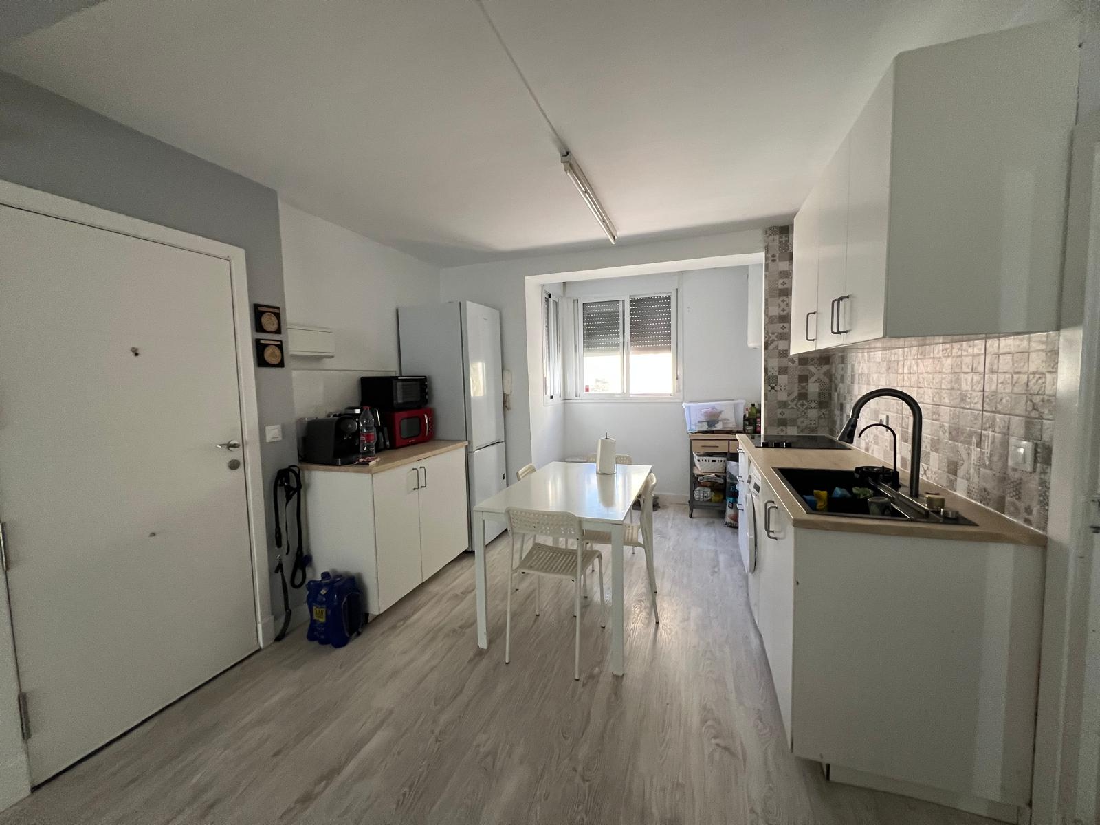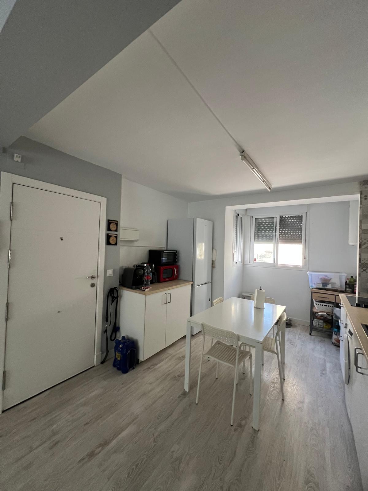 Piso en primero planta. Salón con cocina abierta, baño, tres habitaciones convertidas en dos.