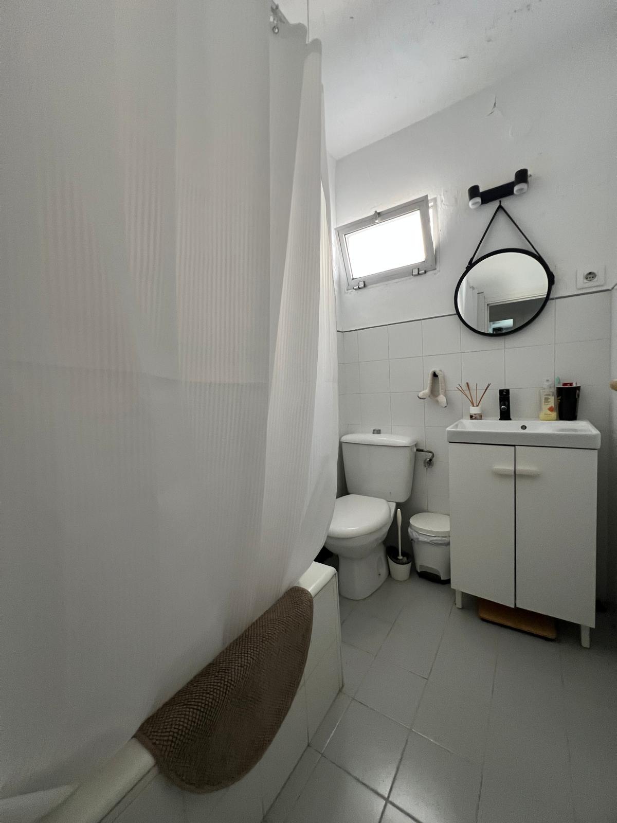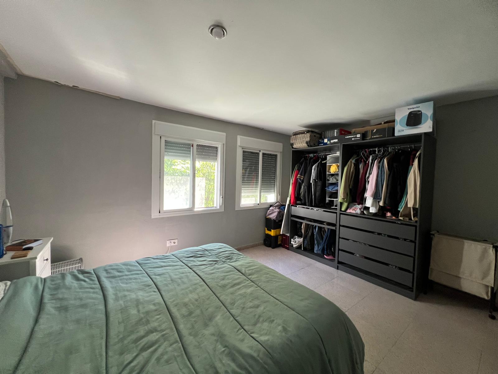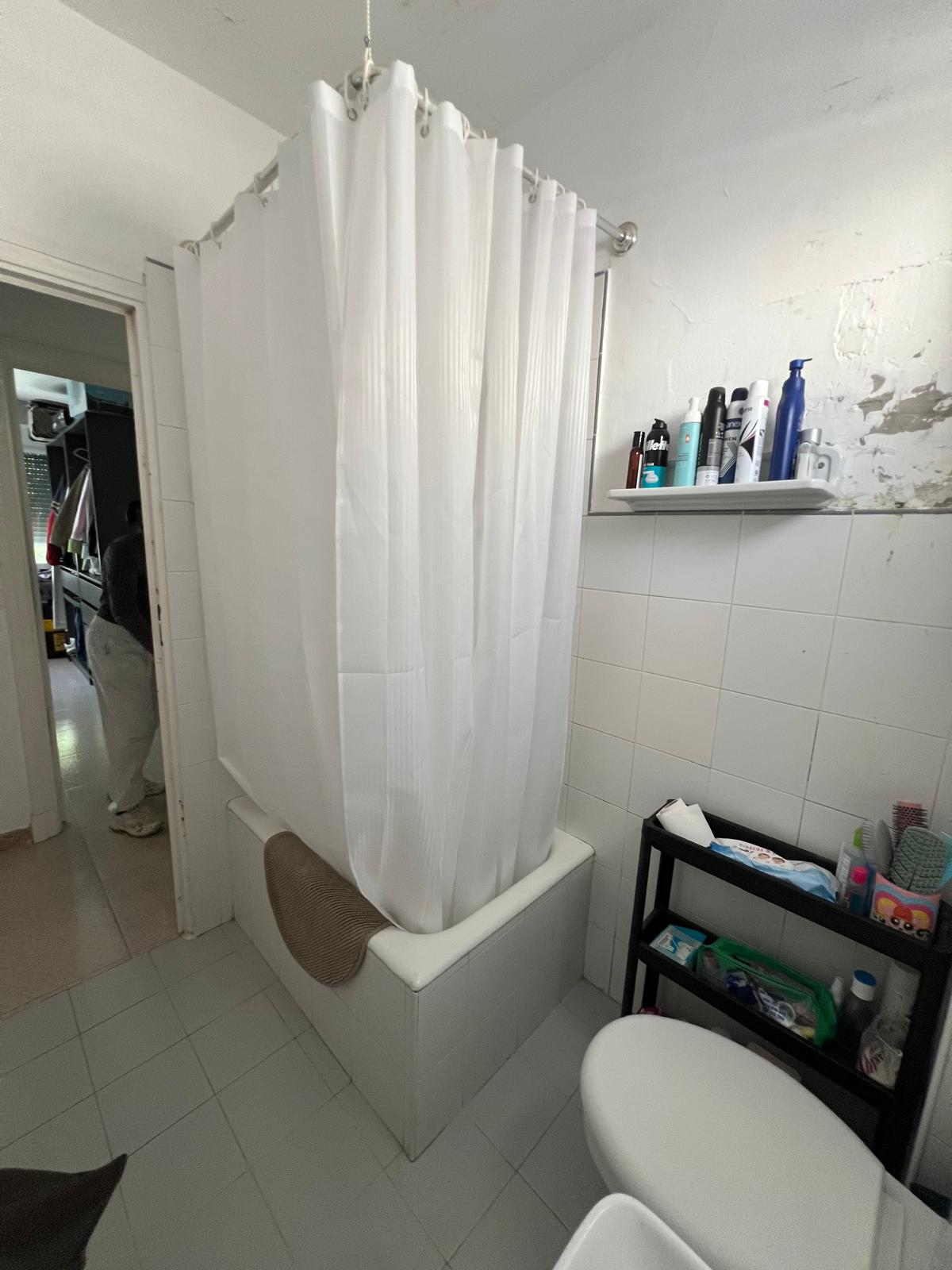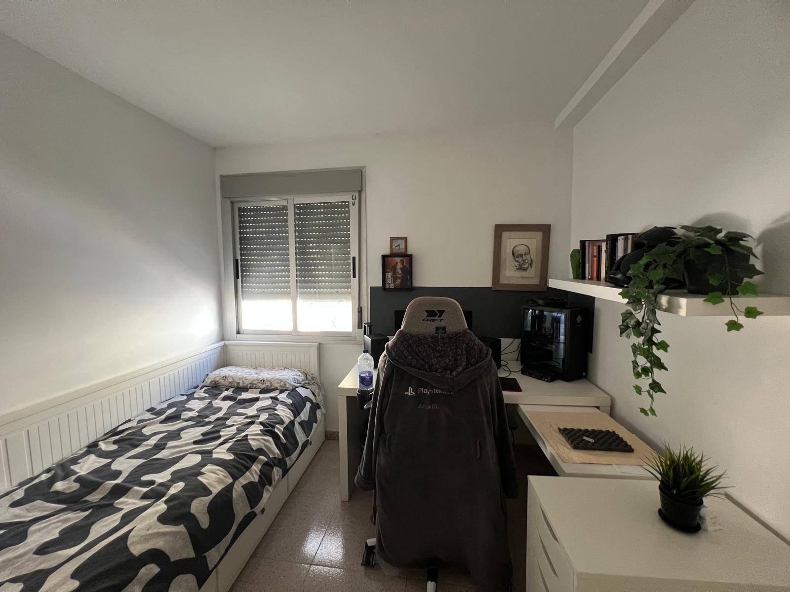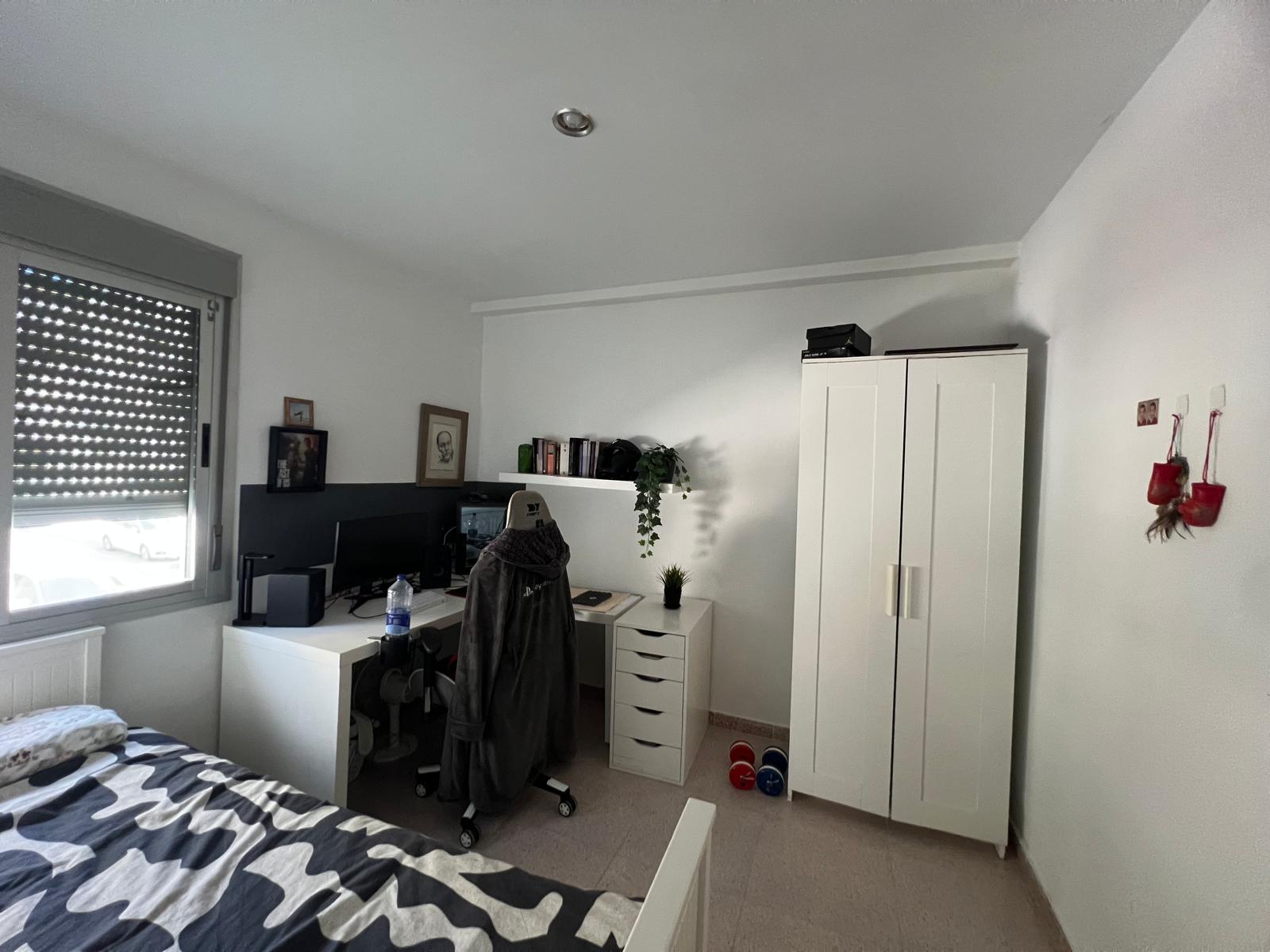 Piso en primero planta. Salón con cocina abierta, baño, tres habitaciones convertidas en dos.
